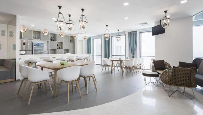 茶水間的設(shè)計:此處位于一個開放的空間之中,在設(shè)計中設(shè)計師將茶水間安置在空間的一側(cè),這樣設(shè)計的目的就是釋放更多的空間,為茶水間的輔助功能讓位,輔助功能就是休息場所、交流場所,設(shè)計師這樣做的目的就是希望將空間發(fā)揮到最大化,讓員工有更多減壓的場所。