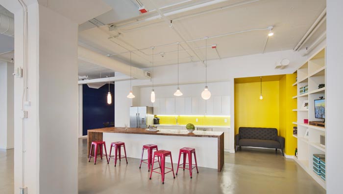 茶水間的設計:茶水柜前方有一個加長型的吧臺,足可以坐下企業(yè)大部分人,這樣設計的目的就是讓員工坐在一起討論、溝通、交流,空間在格局設計上把握的也很好,墻體包圍內(nèi)部空間,橢圓形過道包圍吧臺,環(huán)環(huán)相扣,在使用和留白之間達到相對的平衡。