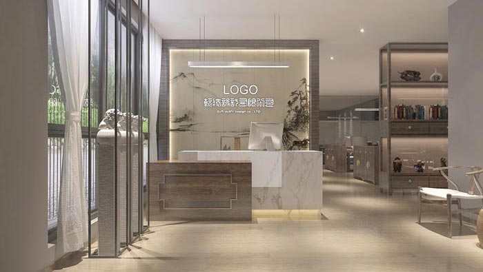 前臺的設計:設計師在設計之初,對戶外的采光進行了仔細的研究與比對,最后在中式風格的前提下采用了淺灰色做為主色調(diào)來設計,這樣設計的目的就是希望把握內(nèi)外之間的平衡,讓室內(nèi)如室外的感覺如出一轍,讓客戶在進入空間后不會產(chǎn)生突兀的感覺,仿佛如行云流水一般的自然。
