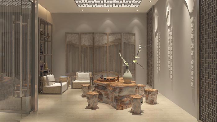 洽談區(qū)域的設計:由于此處的空間屬性較為特殊,所以設計師在設計的時候,需要進行充分的考慮,因為此處需要承擔起洽談、交流、接待的作用,故此設計師與客戶商量之后決定采購一套實木造型茶桌、茶椅,設計師希望以此改變空間的整體屬性,讓空間更趨向于待客之用。