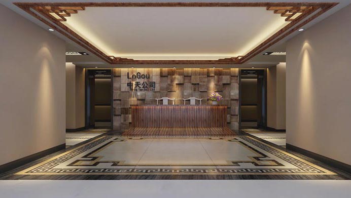 前臺(tái)區(qū)域的設(shè)計(jì):在設(shè)計(jì)中設(shè)計(jì)師將電梯間與過道完美的利用起來,因?yàn)榇颂幨且粋€(gè)T字型的動(dòng)線,故此設(shè)計(jì)師將logo與logo背景墻安置在電梯間對立面的墻壁上,同時(shí)將前臺(tái)也安置在此處,通過設(shè)計(jì)的搭配此處儼然已經(jīng)煥然一新,這樣的設(shè)計(jì)既保留了動(dòng)線的屬性也增加了展示與接待的屬性。