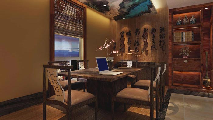 洽談室的設(shè)計(jì):此處位于過道的盡頭,此處與外界隔絕自成一體,設(shè)計(jì)師的目的就是通過前臺(tái)人員將客戶接待?此處,讓客戶在空間中感受到企業(yè)服務(wù)的理念,中式風(fēng)格本身就會(huì)給人以家的感覺,在加上中式家具、墻畫、插畫的點(diǎn)綴,讓空間擁有更多自然的屬性,讓人在此處可以靜下心來感受空間的脈絡(luò)。