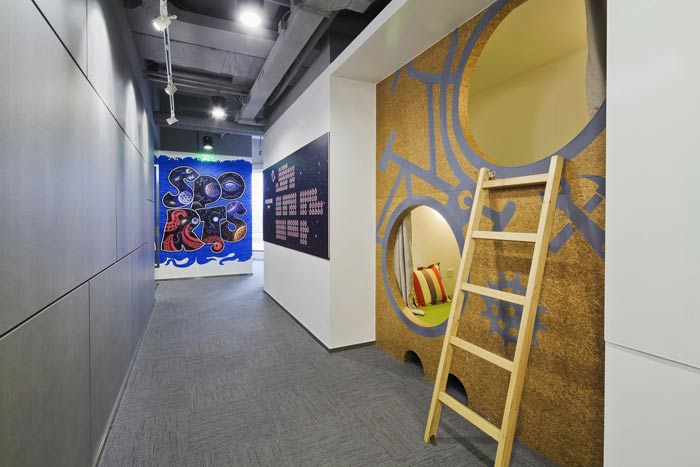科技公司辦公室休息區(qū)設(shè)計(jì):員工通過(guò)圓爬進(jìn)里面,里面可供大家休息之用,這里是屬于員工的秘密空間,現(xiàn)在的人往往都沒(méi)有安全感,故此設(shè)計(jì)師希望為員工打在一處安全、溫馨的空間。