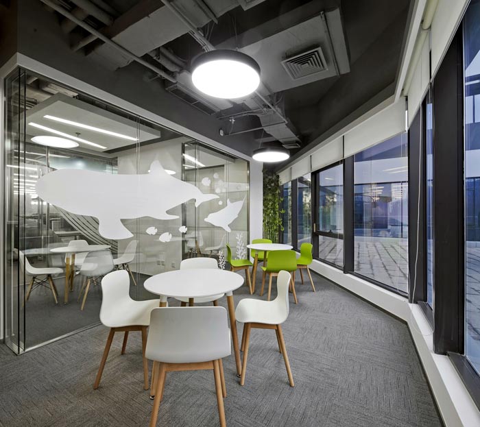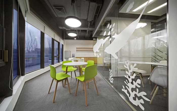 科技公司辦公室接待室設(shè)計(jì):接待室兩邊完全由玻璃隔斷組成,背面的玻璃隔斷由一條鯨魚、魚群組成,一來(lái)形容鯨魚的巨無(wú)霸,希望企業(yè)可以越做越大,二來(lái)水中世界讓空間仿佛有了一絲水的柔性。