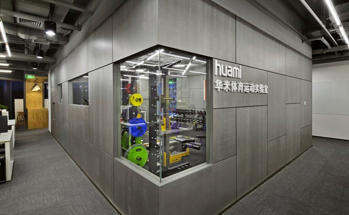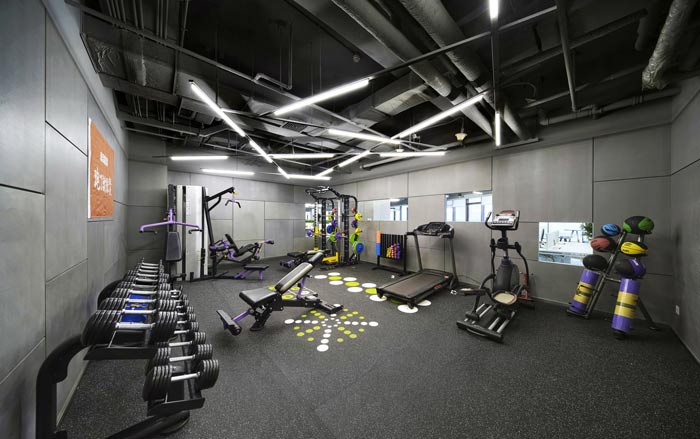 科技公司辦公室健身室設(shè)計(jì):健身房被設(shè)計(jì)師安置在空間的最里邊,設(shè)計(jì)師希望讓員工在這里鍛煉、減壓,現(xiàn)在的人最缺少的就是鍛煉,設(shè)計(jì)師希望員工在這里可以找回曾經(jīng)的美好。