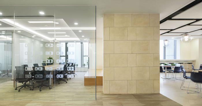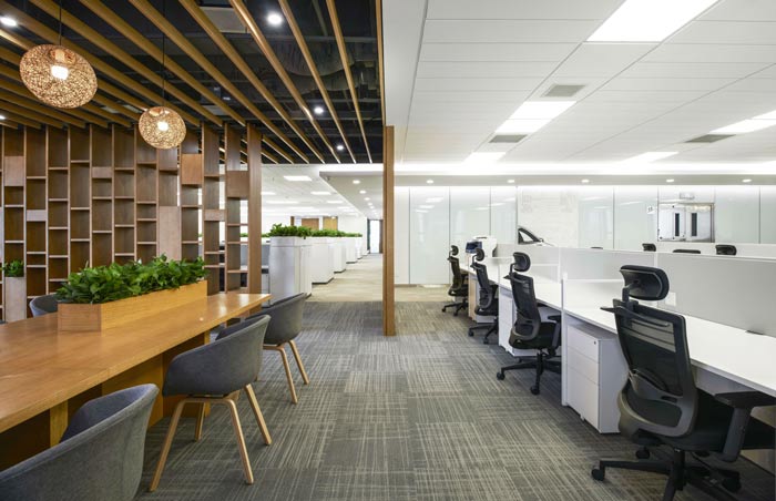 汽車租賃公司辦公室辦公區(qū)設計:共享交流及臨時辦公區(qū),暖色木質(zhì)家具及木格柵,界定出鮮明空間范圍的同時,溫暖的燈飾營造出輕松的交流環(huán)境,讓身心可以在此得到放松。
