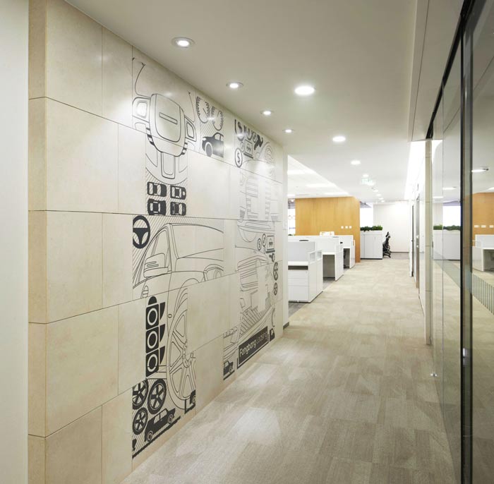 汽車租賃公司辦公室過道設計:山峰、坦途、汽車、構件等相關元素巧妙與空間特征相結合,利用鮮明的色彩和抽象的形制,完美結合功能需要的同時,成為了企業(yè)展示最直觀的傳達。