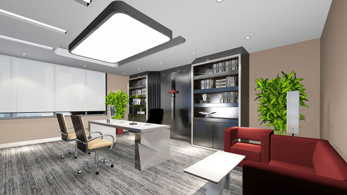總經(jīng)理辦公室的設(shè)計,白色的辦公區(qū)域給人的感覺就是簡潔、明快,富有現(xiàn)代感,深紅色的接待區(qū)域為空間帶來穩(wěn)重、成熟的空間屬性,綠植的設(shè)計為一方面為空間增加活力,另一方面為空間增加一絲涼意。