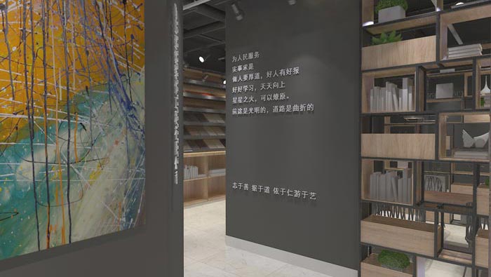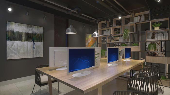 墻畫的設計:整個空間的墻色為黑色,燈光代表的是白色,電腦的選擇也是白色,墻畫的選擇也是白色,設計師就是要中和空間的色彩,因為黑一點形成一定的體量,就一定會讓人有一種孤獨之感,自此白色的出現(xiàn)就十分有必要,但是如何出現(xiàn)也在考驗設計師美學方面的素養(yǎng)。