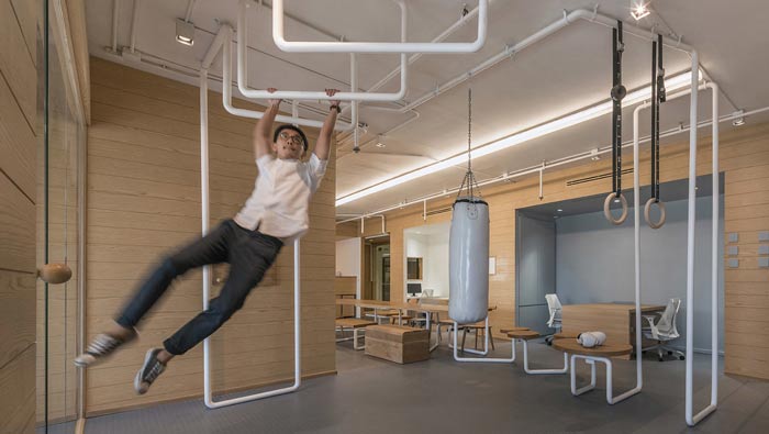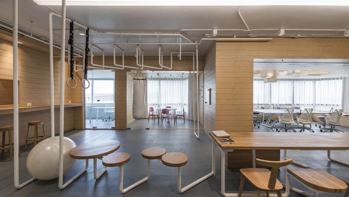 IT公司辦公室單杠區(qū)設計:此處主要是員工活動、健身的區(qū)域,這也是此次辦公室設計的一大亮點,設計師將健身巧妙的融入空間,當員工勞累的時候,可以來這樣鍛煉一下,一來強身健體,二來打破心中憂郁。