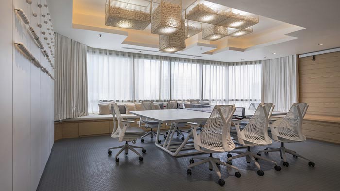 IT公司辦公室會議休息區(qū)設計:會議室與休息區(qū)域相互融合在一起,表達了設計師勞逸結合的設計理念,問題的解決往往不是一次會議就可以解決的,而有效的休息正是彼此相互交流的最佳時機。