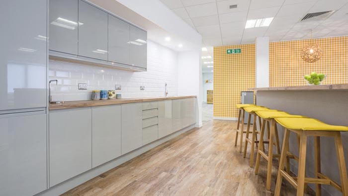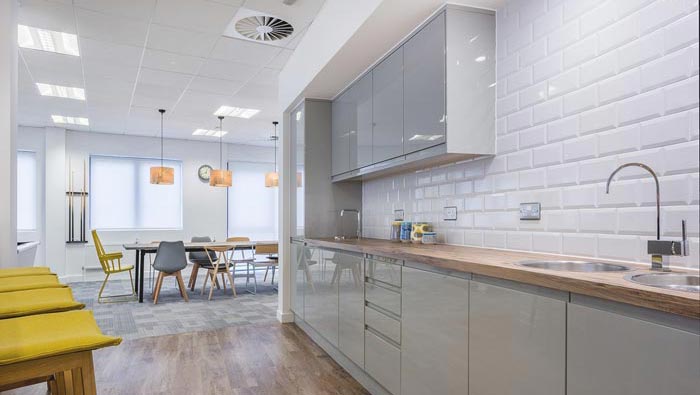 茶水間的設(shè)計(jì):設(shè)計(jì)師在設(shè)計(jì)的時(shí)候,采用類似三角形的設(shè)計(jì)模型,一方面為茶水柜臺臨墻而建,另一方面設(shè)計(jì)了一個(gè)三角形的吧臺,在設(shè)計(jì)師的眼中茶水間是企業(yè)為數(shù)不多可以休息、交流的場所,故此設(shè)計(jì)師希望吧臺可以承載起員工休息、交流的功能屬性。