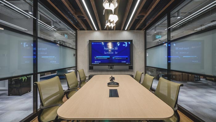 匯報(bào)區(qū)域的設(shè)計(jì):此處主要為匯報(bào)工作之用,周圍設(shè)計(jì)師利用隔斷將其進(jìn)行分離,目的就是為了不受影響,但同時(shí)透明玻璃也為空間提供了足夠的自然光,大液晶屏幕掛在空間的前方,一切都清清楚楚,設(shè)計(jì)師的目的就是希望匯報(bào)可以順順利利。