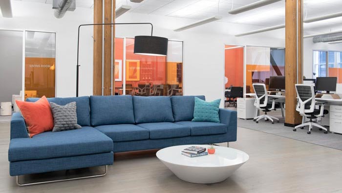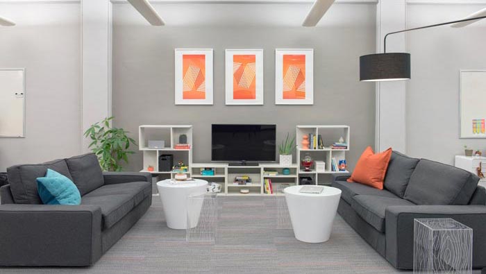 休息區(qū)域的設(shè)計:此次第一眼看起來更像是一個客廳,家的感覺是給人的第一感覺,設(shè)計的目的就是讓員工感受到企業(yè)是一個大的家庭,讓員工在此處感受到家的氛圍,這樣更能促進創(chuàng)意的產(chǎn)生,同時此處也可以做為交流區(qū)域,促進企業(yè)與客戶之間的距離。