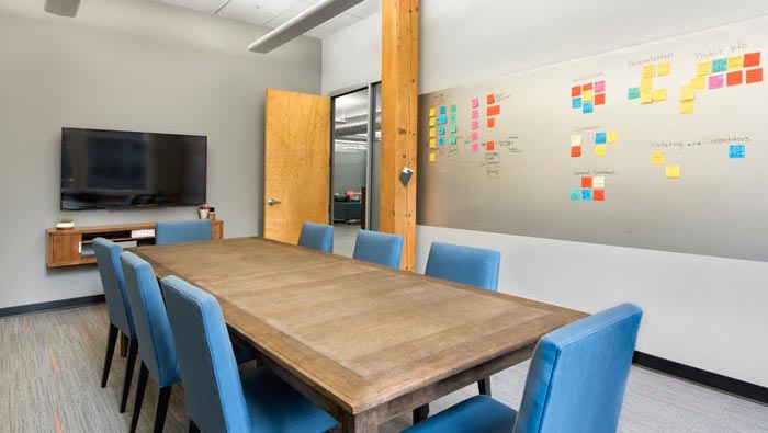 會議室的設(shè)計:在設(shè)計中設(shè)計師有意的縮小了會議桌的面積,在設(shè)計師看來只要夠用就可以沒必要過于浪費,設(shè)計師的重點在于釋放空間的壓力,也就是釋放更多的空白空間,以此在會議開展的時候為企業(yè)帶來更多的想象空間,想象空間就是希望讓大家靜下心來認真思考,同時也為大家提供了踱步的空間,希望通過動與靜之間的互換達到快速解決問題的作用。