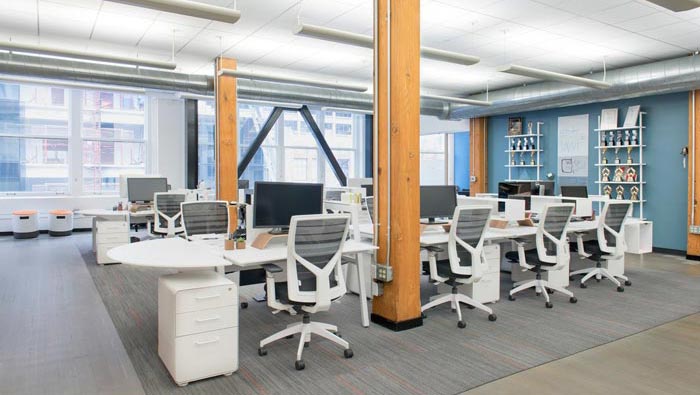 辦公區(qū)域的設(shè)計:空間柱子是設(shè)計師設(shè)計的重點與參考,設(shè)計師首先就是將線路通過管道裸露在外部,這樣就是有意的模糊柱子的屬性,讓人下意識在意到線路而模糊柱子,辦公桌在規(guī)劃中以四根立柱為基線,與橫柱相平,這樣可以有效的維護整個空間的完整,同時也增加了空間的層次感。