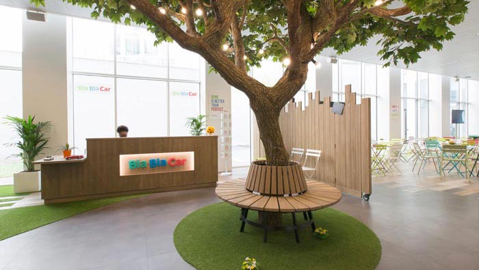 前臺的設計:設計師以自然——樹為設計的前提,將樹移植在空間之中,設計師的想法就是以綠色來表現企業(yè)的服務,讓客戶進入后感覺到眼前一亮,但又不會感到突兀,在樹根處以一圈圓形地毯、圓形座椅包圍,讓客戶在樹下休息可以感受到自然的氣息,綠色的地毯在設計師的裁剪下形成一個動線的外圍,形成了宛若天成的動線起到指引的作用。