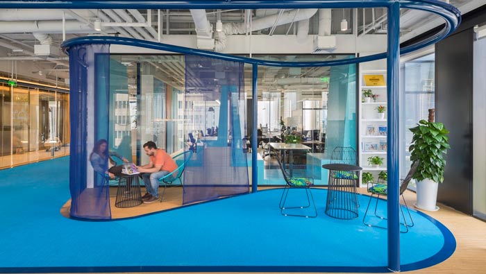旅游公司辦公室活動隔斷設計:設計師在辦公室設計的時候,幾乎所有的隔斷都是可以移動的,也就是說需要的時候隨時可以組成一個空間,但是在不需要的時候,玻璃隔斷也會打開,將所有空間連接起來。