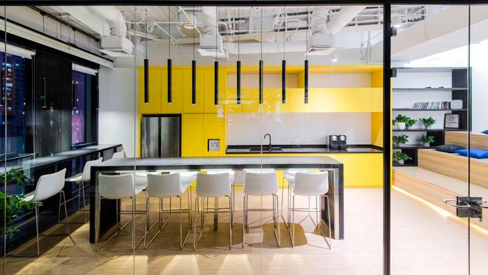 旅游公司辦公室茶水間設計:茶水間分為好幾個部分組成,其中由茶水柜、吧臺、座椅、休息區(qū)構成,在這里員工可以得到很大的放松,同時此處也可以讓員工躺在這里休息、閱讀書籍,以此來緩解員工疲勞的身心。