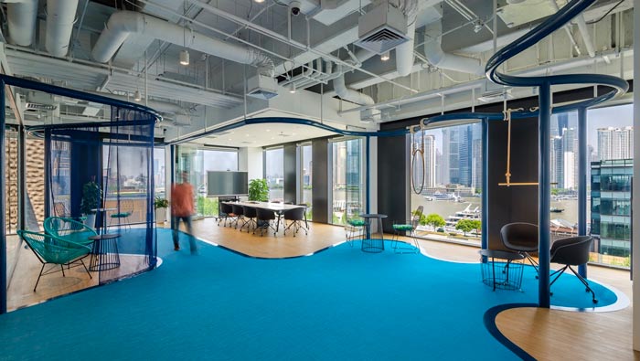 旅游公司辦公室動線設計:企業(yè)對于地面的要求是一平二防滑,設計師在聽到要求之后,就想到了自流平,但考慮到自流平與整個空間不相和諧,最后設計師采用色彩之間的契合達到空間之間的相互融合。
