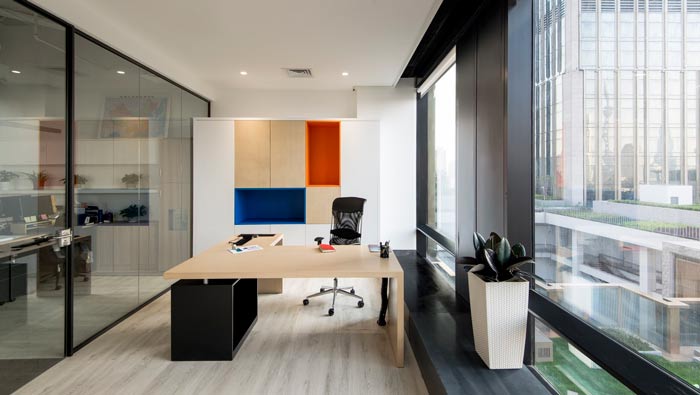 旅游公司總經理辦公室設計:總經理辦公室位于空間的一側,在與總經理交流的時候,設計師了解到總經理本人喜歡簡單一點,此地采光、風景、位置俱佳,即滿足辦公的需求,同時也滿足休閑的需求。