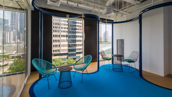 旅游公司辦公室休息區(qū)設計:在這里可以俯視城市的眾多美景,同時此處也是員工的休息區(qū)與辦公區(qū),企業(yè)沒有特別規(guī)定員工一定要在辦公區(qū)域辦公,而是希望給他們相對的自由,讓員工在這里找到家的感覺。