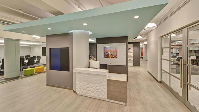 交流區(qū)域的設(shè)計(jì):設(shè)計(jì)師在設(shè)計(jì)的時(shí)候,將其安置在辦公空間的前端,此處是設(shè)計(jì)師預(yù)留的大型開放式辦公空間,設(shè)計(jì)師為了有效的將空間與辦公空間進(jìn)行分離,采用了有色的地毯與頂部的造型設(shè)計(jì)來進(jìn)行有效的區(qū)分,雖然在個(gè)體上看著是分離了,但是在整體上它卻為整個(gè)空間的結(jié)合起到很大的粘合作用。
