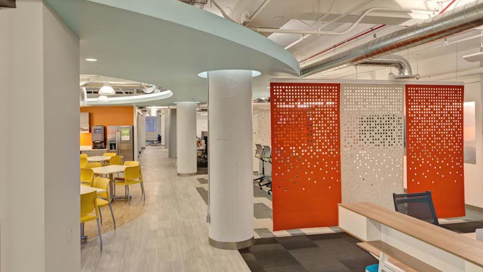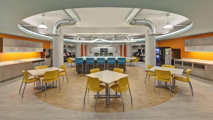 茶水間的設(shè)計(jì):設(shè)計(jì)師在設(shè)計(jì)的時(shí)候,將其安置在一個(gè)獨(dú)立的空間之中,整個(gè)空間采用圓形進(jìn)行設(shè)計(jì),在圓形的外部采用六角形進(jìn)行分布,以此造型為基礎(chǔ)增加空間的容納能力,設(shè)計(jì)師希望讓員工在此處交流、休息、玩耍、娛樂,不斷進(jìn)步、不斷成長。