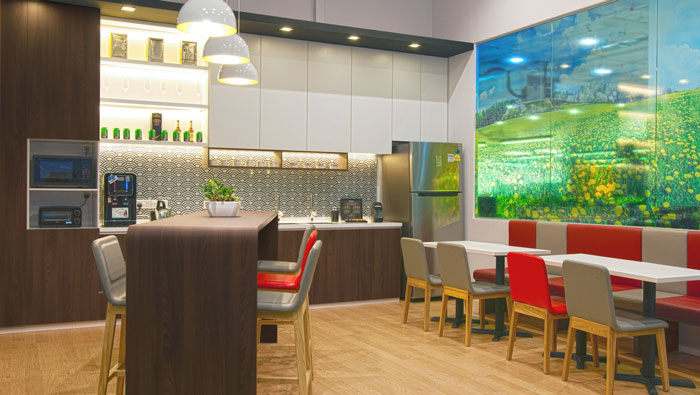 ? 茶水間的設(shè)計:設(shè)計師在設(shè)計的時候,將其安置在一個獨立的空間之中,這樣設(shè)計的目的就是為了與外界隔絕,設(shè)計師希望讓員工在此處不會受到外界工作壓力的影響,設(shè)計師希望讓員工在此處相互之間交流與工作無關(guān)的話題,讓緊張的腦細(xì)胞得到緩解,設(shè)計師認(rèn)為辦公也需要一張一弛,這樣對于員工的創(chuàng)造性有很大的促進(jìn)作用。