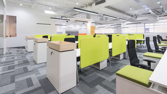 ? 辦公區(qū)域的設(shè)計:設(shè)計師在設(shè)計的時候,在整體上依然采用了開放式的設(shè)計手法,只是在細(xì)節(jié)上做了一點小小的調(diào)整,就是在辦公桌的后方加上了可上可下的擋板,這樣的設(shè)計有效的規(guī)避了開放式空間的缺點,在滿足辦公區(qū)域開放的同時也為其打造私人的辦公區(qū)域,為每一個人預(yù)留了個人空間。