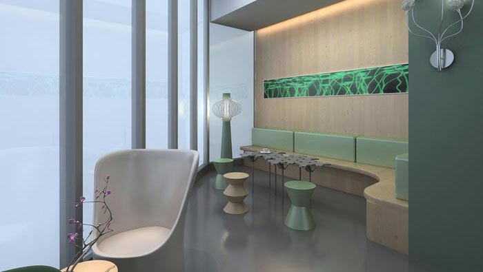 休息區(qū)域的設(shè)計(jì),設(shè)計(jì)師在設(shè)計(jì)的時(shí)候,將其安置在一獨(dú)立的三角區(qū)域,此處給人的第一感覺就是安全、溫暖,讓忙碌的人們,在此處為自己充電,俯視整個(gè)城市,不管對(duì)于心境的提升,還是減壓都有非常好的效果。