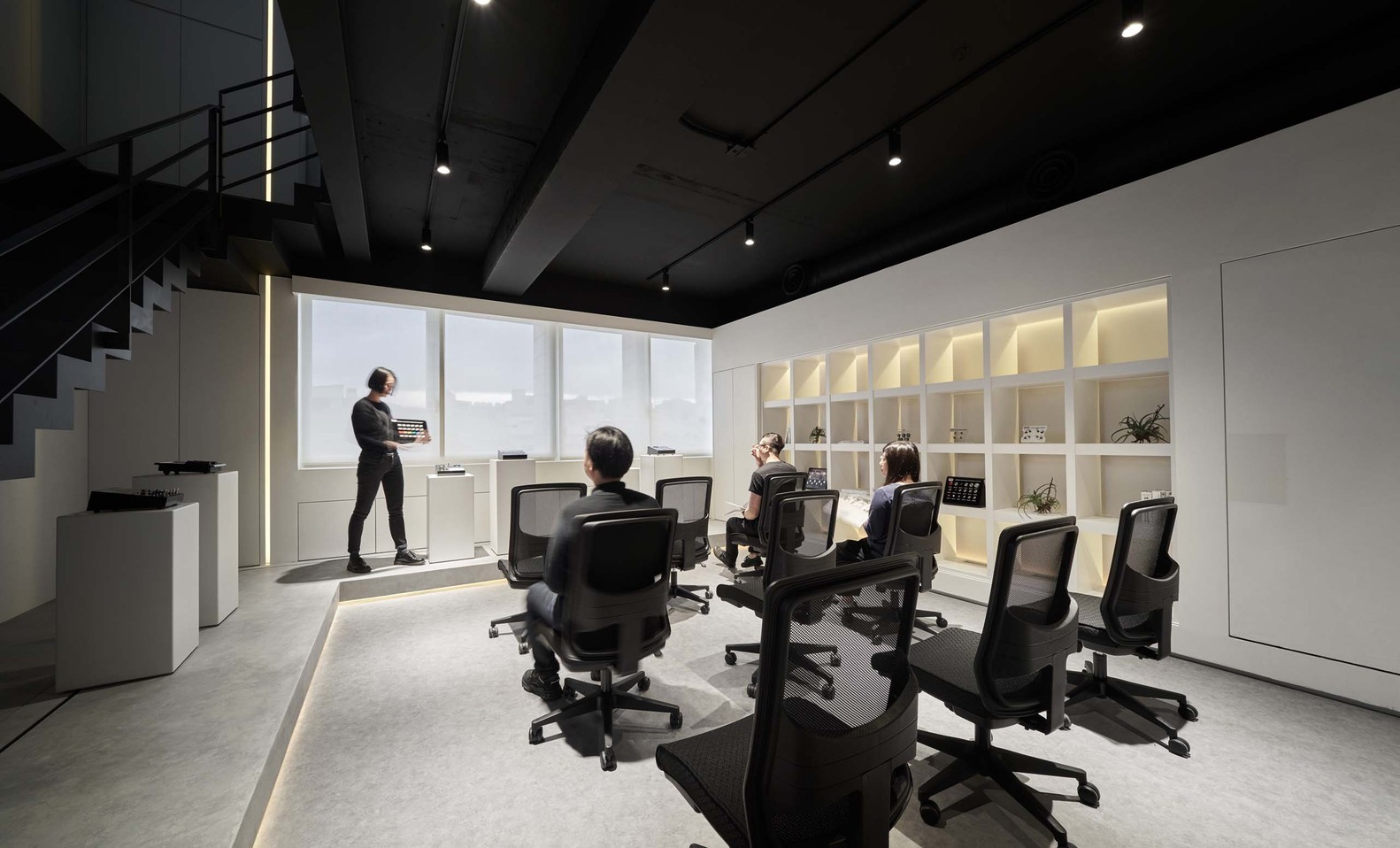 這次帶來一家創(chuàng)意銷售辦公室裝修設計的案例,空間面積218平方米,通過動線規(guī)劃將展售行為重新圍塑,利用開放空間里采光的明暗對比,區(qū)劃出辦公空間并把會議及展示空間加以融合,借此打破會議和銷售行為之間的藩籬,拉近產品與客戶之間的溝通距離。 會議空間通過開放動線,隱性地引導著銷售流程,同時能提供產品說明以及員工教育訓練的使用可能性,透過場域的留白讓展示保有較多的使用彈性,吸引來訪者有效的聚焦于微型開關產品。