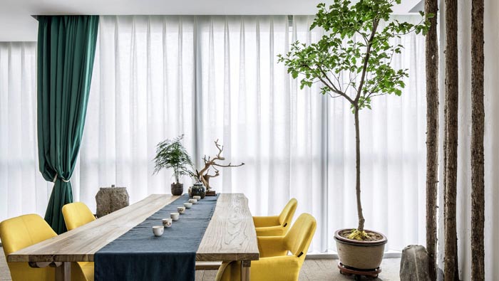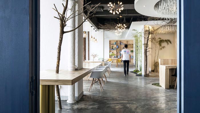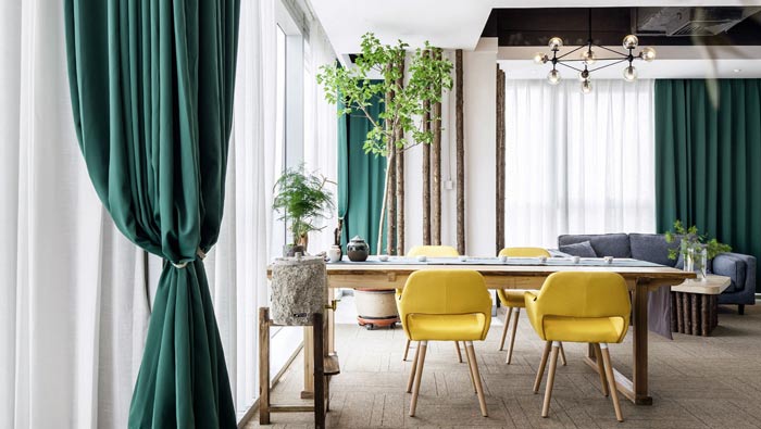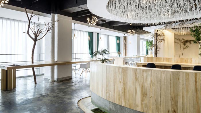 環(huán)保公司辦公室左側(cè)設(shè)計(jì):前臺(tái)位于空間的中央,往左走看到的有樹木、綠竹與燈光組成的開放式辦公空間,三者相互結(jié)合在一起,無形中增加了空間幽深之感,在點(diǎn)綴空間的同時(shí),也加深了空間的視覺感受。