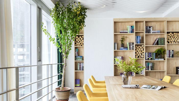 環(huán)保公司辦公室左側(cè)辦公區(qū)設(shè)計(jì):此處位于內(nèi)部左側(cè)區(qū)域,在這里我們夢(mèng)寐已久的自然達(dá)到頂峰,陽光照入室內(nèi)、綠植光鮮奪目,木材散發(fā)著時(shí)間的年輪,一切的一切無不在訴說自然的美好。