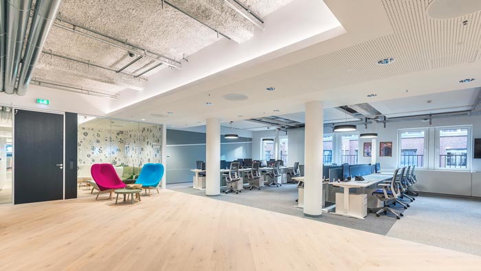 辦公區(qū)域的設(shè)計(jì):因?yàn)榭臻g本身有一些柱體存在,且無法去除,在此基礎(chǔ)上設(shè)計(jì)師利用色彩、材質(zhì)的不同,以柱體為分割點(diǎn)將空間一分為二,但是在兩個(gè)空間之間卻沒有實(shí)體的任何材質(zhì),這也是設(shè)計(jì)師的高明之處,這樣一方面去除了柱體對(duì)于空間的影響,同時(shí)空間的通暢性也大大提升。