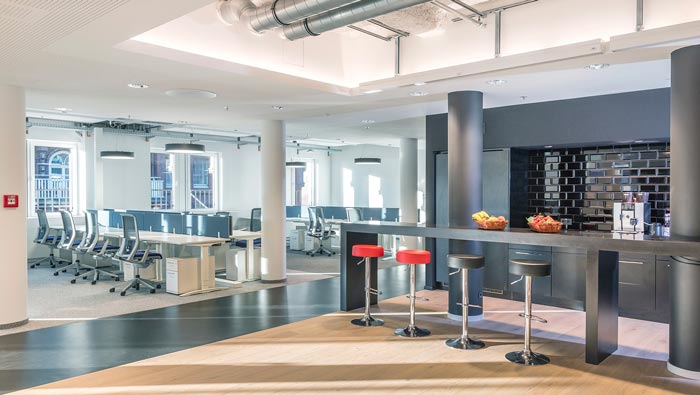 茶水間的設(shè)計(jì):此處位于進(jìn)門區(qū)域的隔斷墻之后,也是進(jìn)入內(nèi)部空間的必經(jīng)之路,由于此處位于兩個(gè)辦公區(qū)之間,故此將茶水間安置在此處,吧臺(tái)在裝修的時(shí)候就將柱體包裹在其中,目的就是為了弱化柱體對(duì)于空間的影響,同時(shí)也是為了將空間開發(fā)到極致。