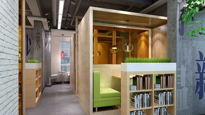 前臺(tái)過道的設(shè)計(jì),設(shè)計(jì)師利用融合的方式,將休息區(qū)域延伸到過道,一則對(duì)空間利用到極致,二則凸顯了人性化設(shè)計(jì)。