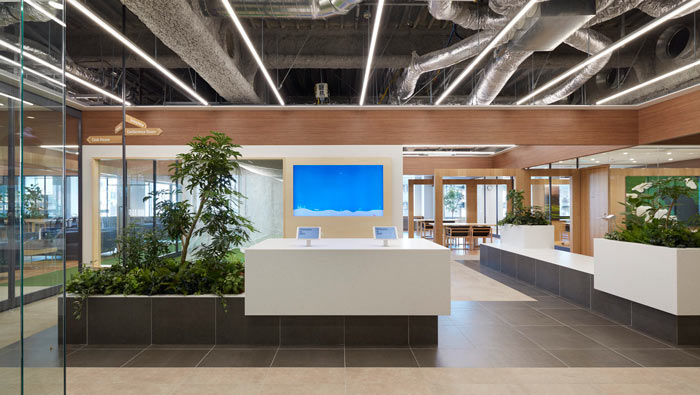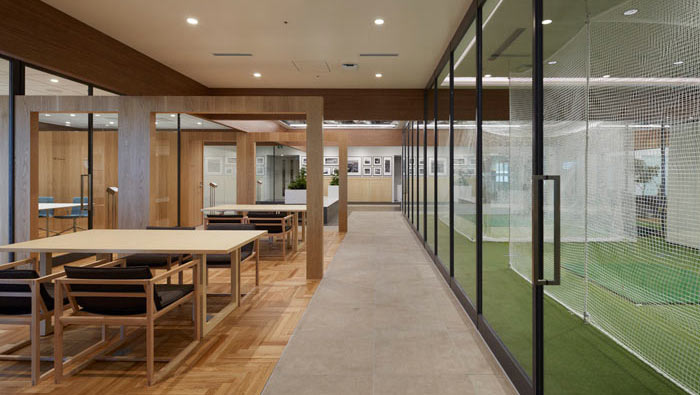 國際貿(mào)易公司辦公室過道設(shè)計:在會議室與休息區(qū)域之間,設(shè)計師也預(yù)留了過道,過道好似木橋,將內(nèi)、外空間連接在一起,設(shè)計師希望用不同的設(shè)計手法點(diǎn)綴空間。