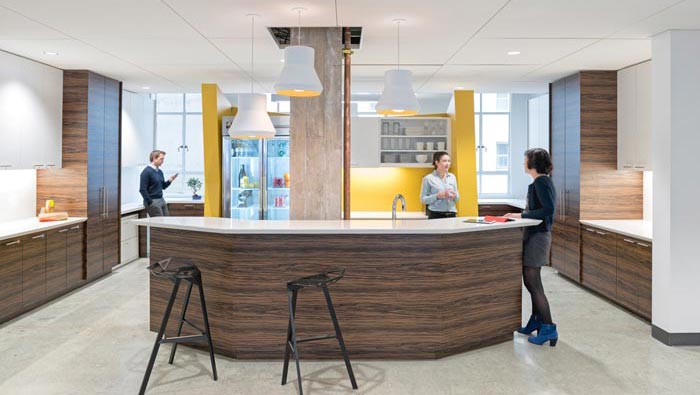 茶水間的設(shè)計:設(shè)計師在設(shè)計的時候,將其安置在空間的中心區(qū)域,此處可以說是空間的一個中心聚集地,在設(shè)計師看來茶水間是企業(yè)為數(shù)不多的無壓力場所,吧臺本身也有休息、娛樂的意味,設(shè)計師希望讓員工在此處可以相互交流、相互了解,以此增加企業(yè)的內(nèi)部向心力。