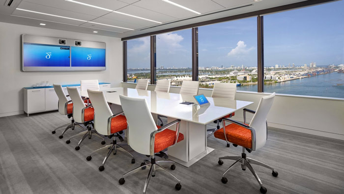 辦公室會(huì)議室設(shè)計(jì):此處與前臺(tái)相鄰,設(shè)計(jì)師這樣設(shè)計(jì)的目的,是希望會(huì)議室可以額外承擔(dān)起接待、洽談、交流的作用,設(shè)計(jì)師的想法就是讓一個(gè)空間可以多樣化,讓空間利用達(dá)到最大化。