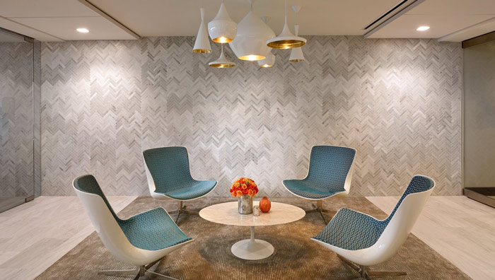 辦公室接待區(qū)域設(shè)計(jì):此處與前臺(tái)空間在一個(gè)空間之中,因?yàn)榈靥旱脑蜃屍鋮^(qū)別于整個(gè)空間,四個(gè)座椅的擺放剛好形成一個(gè)圓形,在使用上更有利于溝通,在寓意上有圓滿的意味在其中。