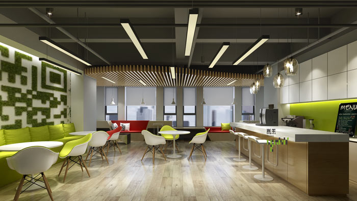 網絡辦公室茶水間設計:空間很大一部分被用來作休息之用,設計師希望員工可以在這里遠離喧鬧的工作、與快速發(fā)展的社會進程,在此地回歸自己、找回自己,為下一步的進步積蓄能量。