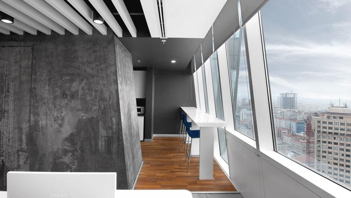 茶水間的設(shè)計(jì):此處位于窗邊的空間,設(shè)計(jì)師這樣設(shè)計(jì)的目的,就是希望將此處的優(yōu)點(diǎn)完美的發(fā)揮出來,吧臺位于窗邊,在這里可以眺望整個(gè)城市,設(shè)計(jì)師希望員工在這里可以放飛自己,在這里可以暫時(shí)的忘記一切,在自然的景觀中,讓自己得以歸零并重新開始。
