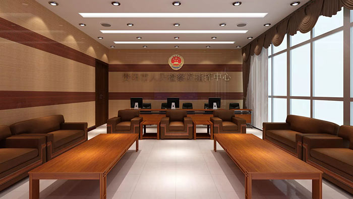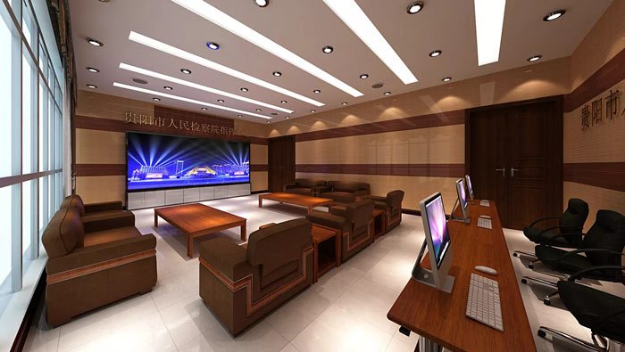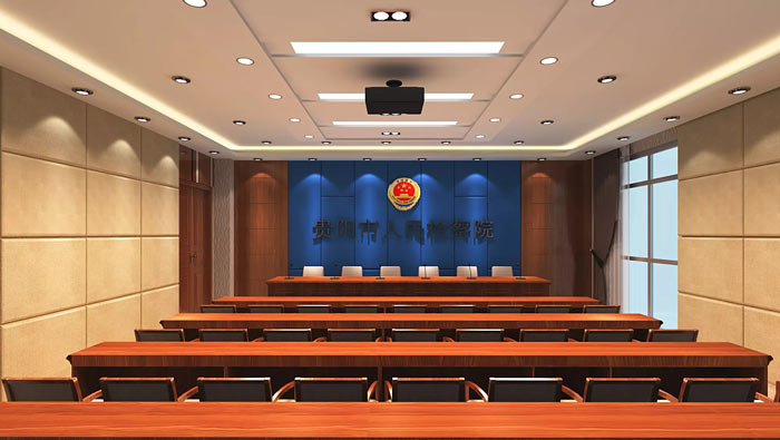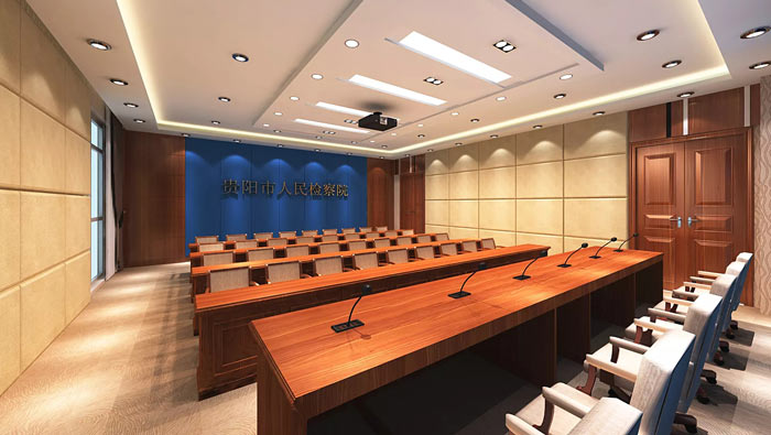 檢察院辦公室會(huì)議室裝修:空間由兩個(gè)部分構(gòu)成,其一就是領(lǐng)導(dǎo)講話區(qū),其二就是參會(huì)區(qū),兩者之間的對立呈現(xiàn)一種自然的呈現(xiàn),目的就是希望讓一切變得自然。