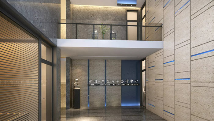 辦公室前廳設(shè)計(jì):中國(guó)--東盟海洋合作中心,幾個(gè)大字明確的表示了企業(yè)的屬性,設(shè)計(jì)師希望表達(dá)的就是直接與開(kāi)門(mén)見(jiàn)山,這樣的設(shè)計(jì)直接、有效。