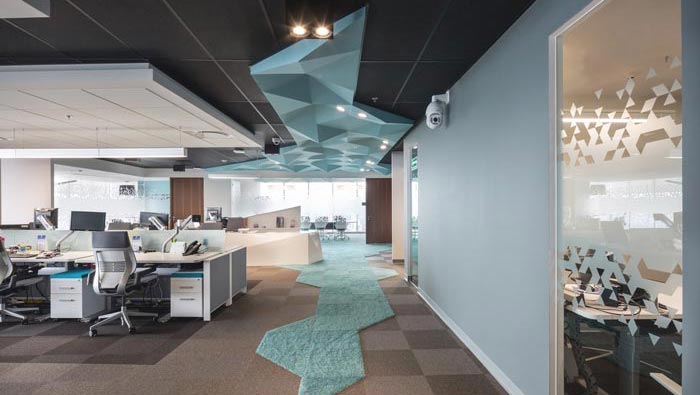 500平方辦公室動線設計:設計師在設計的時候,重點在于強調引導的作用,因為在設計師看來空間越大越會讓人迷失方向,地毯的箭頭處剛好與前臺的箭頭對接在一起,起到承前啟后的作用,設計師的想法就是利用最便捷的方式,起到貫穿空間的效果。