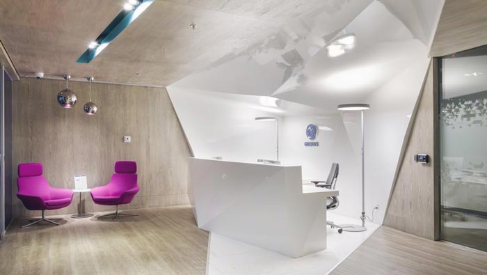 500平方辦公室前臺設計:設計師在前臺的設計中,加入了時尚的設計元素,目的就是要一改企業(yè)之前的形象,菱形的箭頭處直指室內,也起到了引導的作用,讓客戶可以快速的對空間有一個大致的了解。