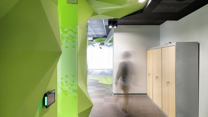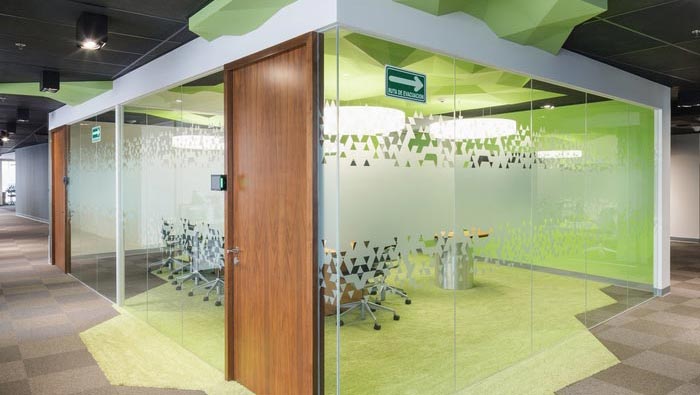 500平方辦公室會議室設計:此處最惹眼的就是不規(guī)則的淺綠色地毯,也正是因為他的不規(guī)則為空間增添了新的韻味,讓企業(yè)的會議變的不在單調,讓員工在綠草成蔭的空間中,發(fā)揮自己的想象力與創(chuàng)造力,去解決當前企業(yè)遇到的問題,在設計師看來保持每一個人的活力至關重要。