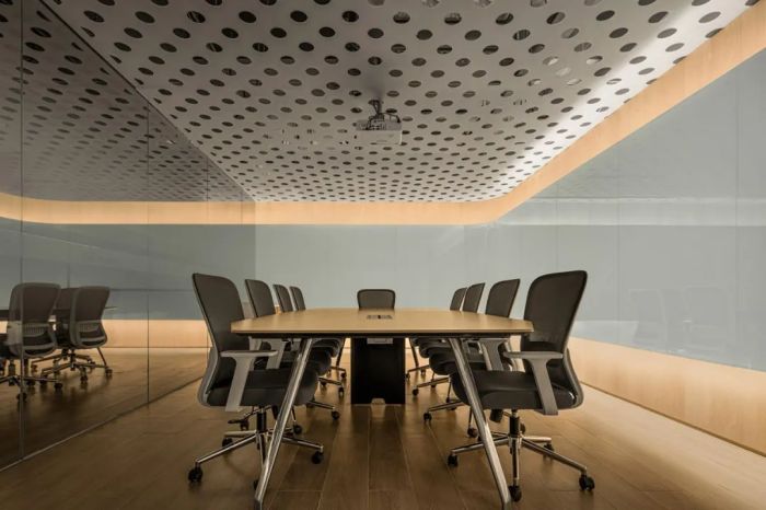 設(shè)計(jì)師受海水的啟發(fā)對(duì)每個(gè)樓層進(jìn)行主題和色彩定義,采用不同色彩、材質(zhì)和空間的組合,為員工創(chuàng)造輕松舒適的辦公環(huán)境。大堂作為企業(yè)形象的展示窗口和整個(gè)計(jì)劃公共屬性最強(qiáng)的樓層,采用聚焦中心的設(shè)計(jì)策略,將設(shè)計(jì)的重點(diǎn)聚焦在前臺(tái)區(qū)域。