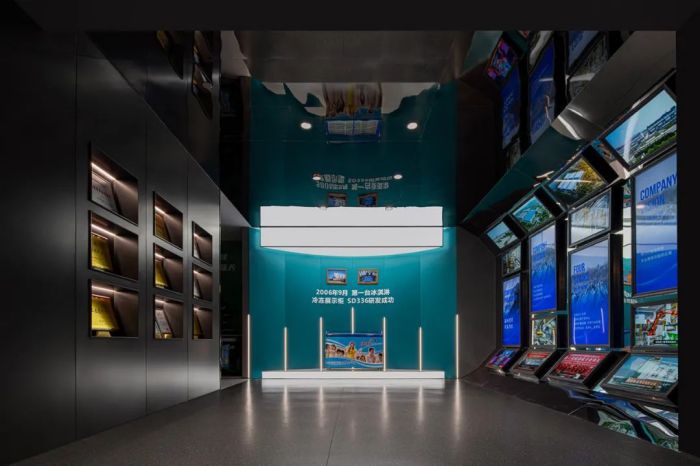 以光為向?qū)?,每個(gè)展區(qū)以線條燈作為聯(lián)系,在暗色中,光成為展廳中最有力的向?qū)В煌该鞫鹊牟牧弦脖徊煌潭葢?yīng)用到空間劃分中。
